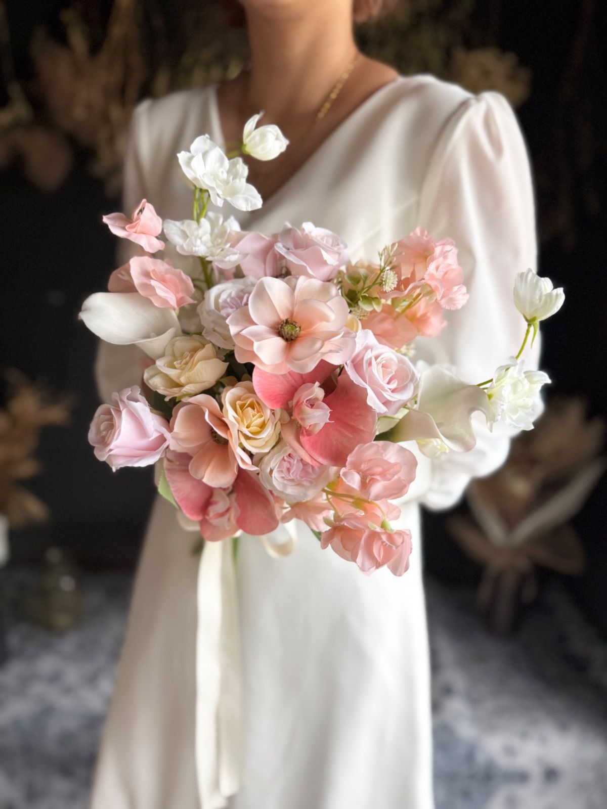 ラナンキュラス、やスイートピー、バラなど可愛い花々をぎゅっと束ねて、やさしく華やかな印象に•*・花の表情豊かなアーティフィシャルフラワーを使用し、ナチュラルさと華やかさを両立しています•*・