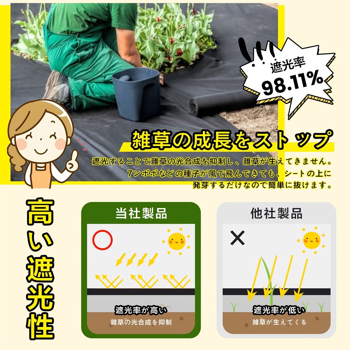 雑草の悩みを解決!UVカット剤入りで長持ちする高耐久雑草防止シートです。