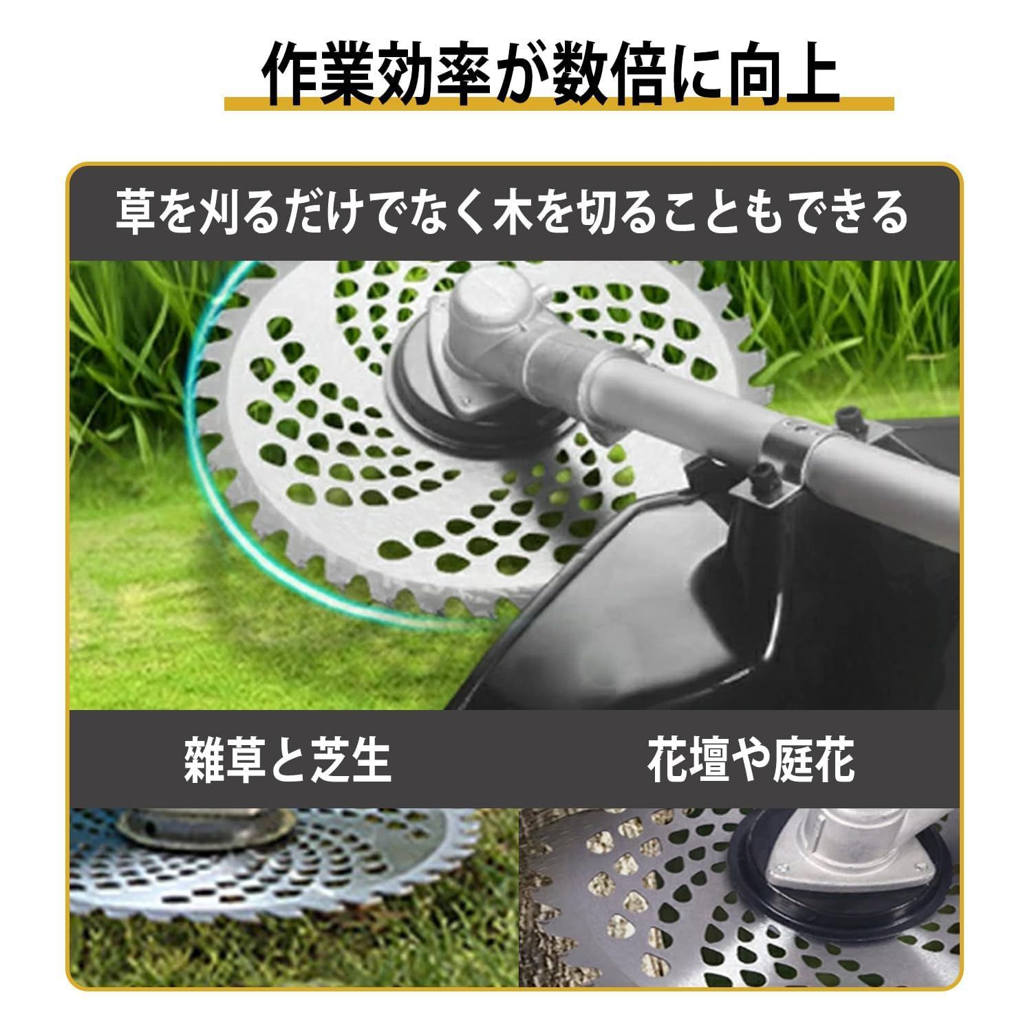 【コードレス&効率的な充電式草刈り機のパワー】大出力の直流ブラシレスモーター/超高速カット、ブラシモーターと比較して、ブラシレスモーターは30%の馬力を増加することができ、20%の消費電力を低減し、20%のカット速度を向上させ、より長い作業時間、新しい9インチ 合金透かしノコギリ、刈り入れがきびきびしています、草刈りの方が早いです、効率が高いです。庭の草木刈りやDIYに最適です。