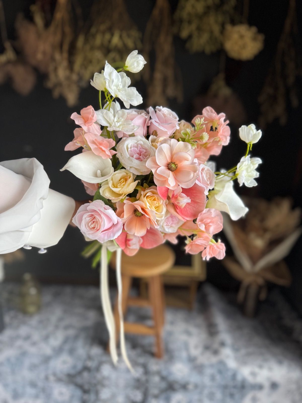 ラナンキュラス、やスイートピー、バラなど可愛い花々をぎゅっと束ねて、やさしく華やかな印象に•*・花の表情豊かなアーティフィシャルフラワーを使用し、ナチュラルさと華やかさを両立しています•*・