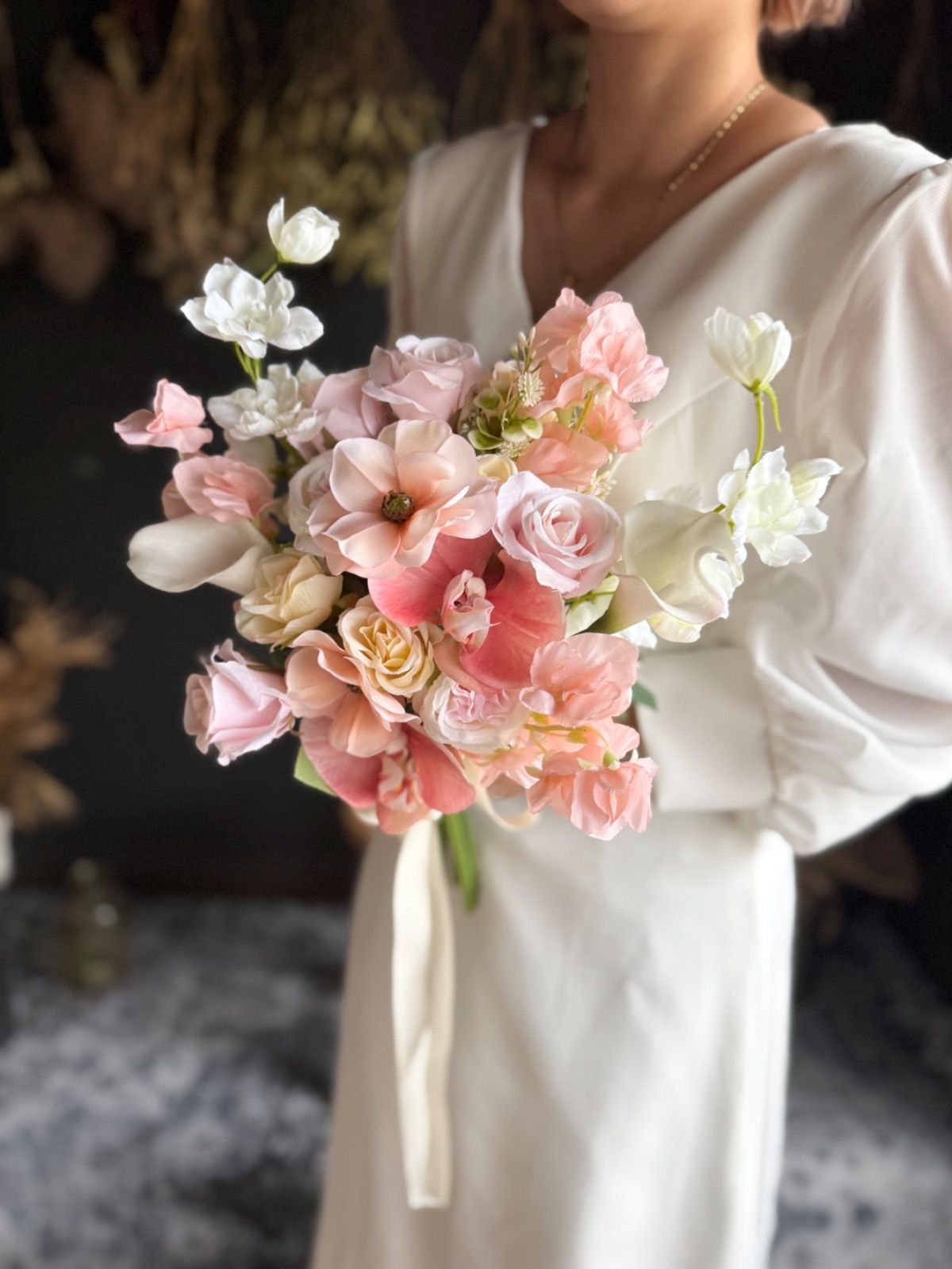 ラナンキュラス、やスイートピー、バラなど可愛い花々をぎゅっと束ねて、やさしく華やかな印象に•*・花の表情豊かなアーティフィシャルフラワーを使用し、ナチュラルさと華やかさを両立しています•*・